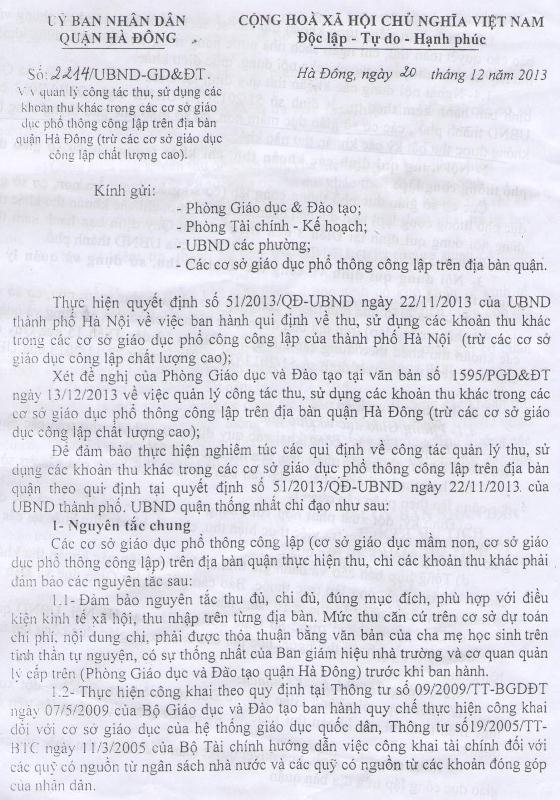 Phòng GD&ĐT Hà Đông hướng dẫn các trường học công tác thu chi học phí và các khoản thu khác năm học 2014-2015
