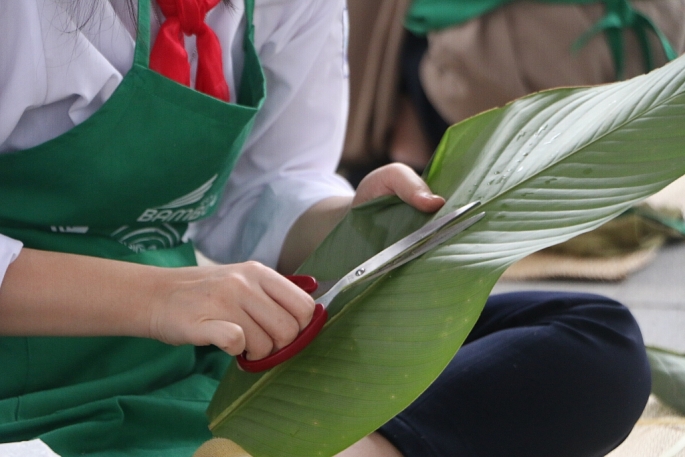 | Tại sân trường, các em được tự tay gói nên những chiếc bánh chưng xanh. |