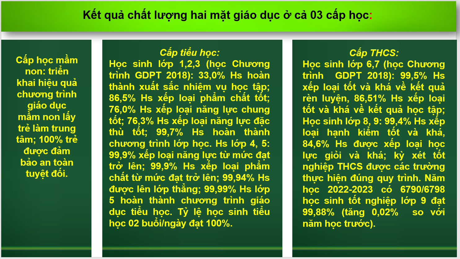 Kết quả chất lượng hai mặt giáo dục ở cả 03 cấp học đều đạt chỉ tiêu đề ra.