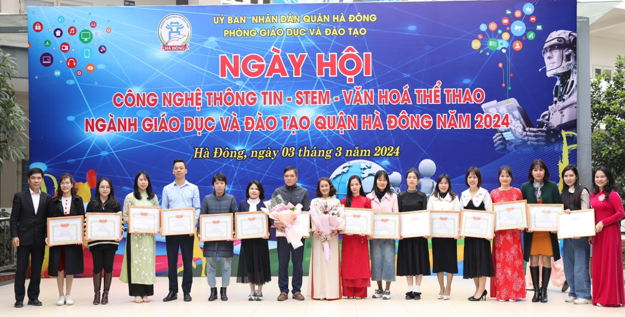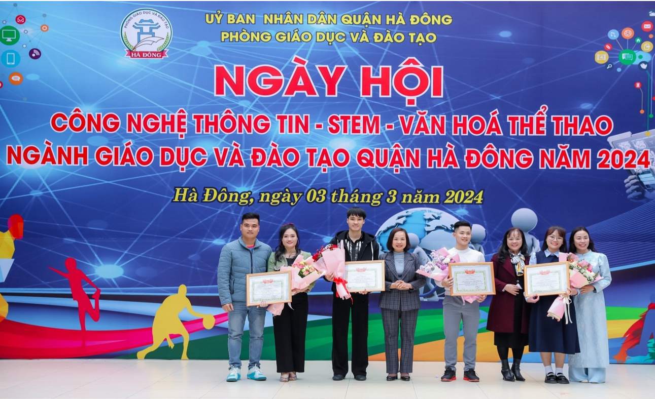 Ngày hội CNTT và STEM quận Hà Đông năm học 2023-2024 đã thu hút sự tham gia của 100% các trường mầm non, tiểu học, trung học cơ sở trên địa bàn quận với 15 gian hàng trưng bày sản phẩm. Ban tổ chức đã công bố kết quả và trao thưởng phần thi sản phẩm CNTT-STEM/STEME. Có 321 sản phẩm, trong đó bài giảng Elearning có 47 giải nhất, 82 giải nhì, 88 giải ba, 104 giải khuyến khích.