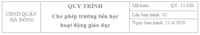 - Quyết định số 1510/QĐ-UBND ngày 14/4/2020 của Chủ tịch UBND thành phố Hà Nội về việc công bố Danh mục thủ tục hành chính lĩnh vực: giáo dục và đào tạo; quy chế thi, tuyển sinh; hệ thống văn bằng chứng chỉ thuộc thẩm quyền giải quyết của Sở Giáo dục và Đào tạo, UBND cấp huyện, UBND cấp xã trên địa bàn thành phố Hà Nội.5.2 Thành phần hồ sơ Bản chính Bản sao Tờ trình cho phép hoạt động giáo dục. x - Bản sao phô tô và mang bản chính để đối chiếu quyết định thành lập hoặc cho phép thành lập trường x 5.3 Số lượng hồ sơ 01 bộ 5.4 Thời gian xử lý 17,5 ngày làm việc, kể từ ngày nhận đủ hồ sơ hợp lệ 5.5 Nơi tiếp nhận và trả kết quả Bộ phận tiếp nhận và trả kết quả giải quyết TTHC 5.6 Lệ phí Không quy định 5.7 Quy trình xử lý công việc TT Trình tự Trách nhiệm Thời gian Biểu mẫu/Kết quả B1 Cá nhân, tổ chức có nhu cầu chuẩn bị và nộp đầy đủ hồ sơ theo quy định tại mục 5.2 về bộ phận tiếp nhận và trả kết quả UBND quận (nộp trực tiếp hoặc qua đường bưu điện) Cá nhân, tổ chức có đề nghị thực hiện TTHC Khi có nhu cầu Thành phần hồ sơ theo mục 5.2