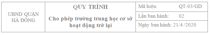 - Quyết định số 1510/QĐ-UBND ngày 14/4/2020 của Chủ tịch UBND thành phố Hà Nộị.5.2 Thành phần hồ sơ Bản chính Bản sao Tờ trình đề nghị cho phép trường THCS hoạt động giáo dục trở lại x 5.3 Số lượng hồ sơ 01 bộ 5.4 Thời gian xử lý 17,5 ngày làm việc, kể từ ngày nhận đủ hồ sơ hợp lệ 5.5 Nơi tiếp nhận và trả kết quả Bộ phận tiếp nhận và trả kết quả giải quyết TTHC 5.6 Lệ phí Không quy định 5.7 Quy trình xử lý công việc TT Trình tự Trách nhiệm Thời gian Biểu mẫu/Kết quả B1 Cá nhân, tổ chức có nhu cầu chuẩn bị và nộp đầy đủ hồ sơ theo quy định tại mục 5.2 về bộ phận tiếp nhận và trả kết quả UBND quận (nộp trực tiếp hoặc qua đường bưu điện) Cá nhân, tổ chức có đề nghị thực hiện TTHC Khi có nhu cầu Thành phần hồ sơ theo mục 5.2